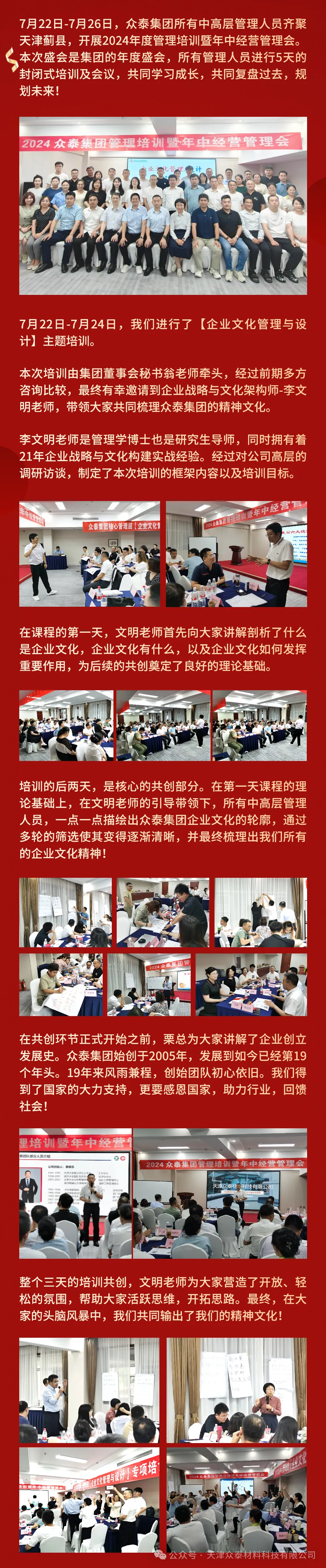 7月22日-7月26日,眾泰集團所有中高層管理人員齊聚天津薊縣,開展2024年度管理培訓(xùn)暨年中經(jīng)營管理會。本次盛會是集團的年度盛會,所有管理人員進行5天的封閉式培訓(xùn)及會議,共同學(xué)習(xí)成長,共同復(fù)盤過去,規(guī)劃未來!